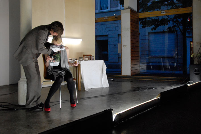 Oleg Zhukov, Ellen Schlootz in: "Our Town. Ruhrort", Regie: Martin Kloepfer, Theater Arbeit Duisburg, Ruhrort 2008