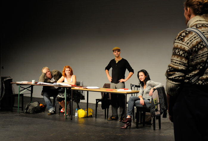 Carsten Caniglia, Alica Weirauch, Alessandro Nania, Katinka Mache, Andre Scioblowski, Alica Weirauch in: „Und keiner will der Kapitalist sein ...“ – Zement. Probe Revolution; Regie: Markus Schlappig, Theater Arbeit Duisburg 2008, Ringlokschuppen Mülheim a.d.Ruhr |