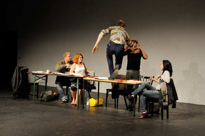 Carsten Caniglia, Alica Weirauch, Andre Scioblowski, Alessandro Nania, Katinka Mache in: „Und keiner will der Kapitalist sein ...“ – Zement. Probe Revolution; Regie: Markus Schlappig, Theater Arbeit Duisburg 2008, Ringlokschuppen Mülheim a.d.Ruhr