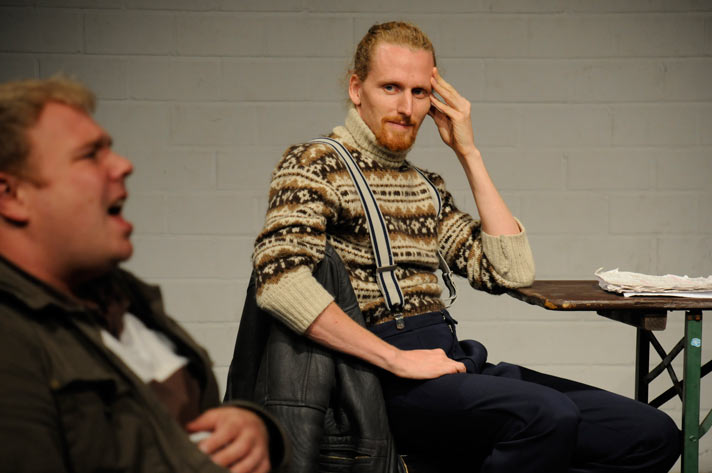 Carsten Caniglia, Andre Scioblowski in: „Und keiner will der Kapitalist sein ...“ – Zement. Probe Revolution; Regie: Markus Schlappig, Theater Arbeit Duisburg 2008, Ringlokschuppen Mülheim a.d.Ruhr