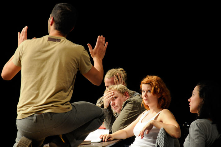 Alessandro Nania, Andre Scioblowski, Carsten Caniglia, Alica Weirauch Katinka Mache in: „Und keiner will der Kapitalist sein ...“ – Zement. Probe Revolution; Regie: Markus Schlappig, Theater Arbeit Duisburg 2008, Ringlokschuppen Mülheim a.d.Ruhr